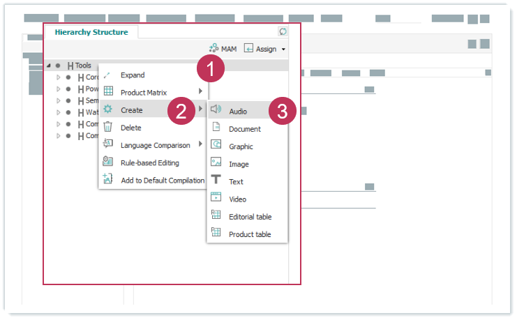 Audioelement erstellen und zuordnen, Handlungsschritte 1-3- Wählen Sie eine Elementkategorie aus.