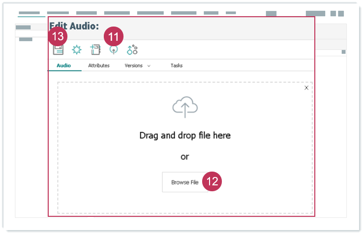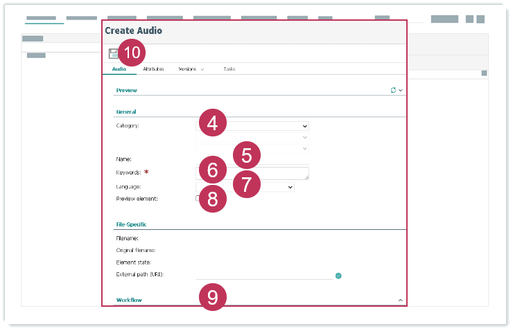 Audioelement erstellen und zuordnen, Handlungsschritte 4-10- Klicken Sie auf Upload.