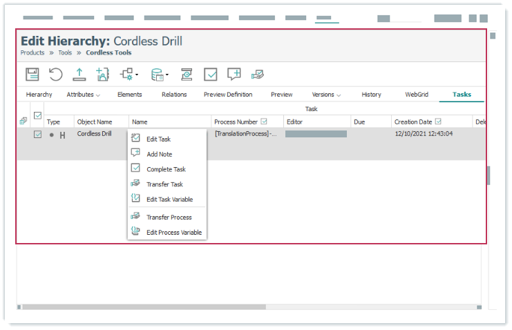 Registerkarte Aufgaben beim Bearbeiten von Hierarchien, Produkten, Produktvarianten, Elementen und Sammlungen