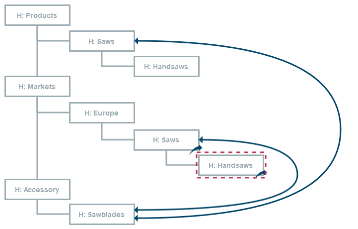 Folgende Abbildung zeigt drei Hierarchien im Hierarchiebaum. Die Hierarchie Products mit untergeordneten Hierarchien, die Hierarchie Europe mit untergeordneten Referenzen und die Hierarchie Sawblades: