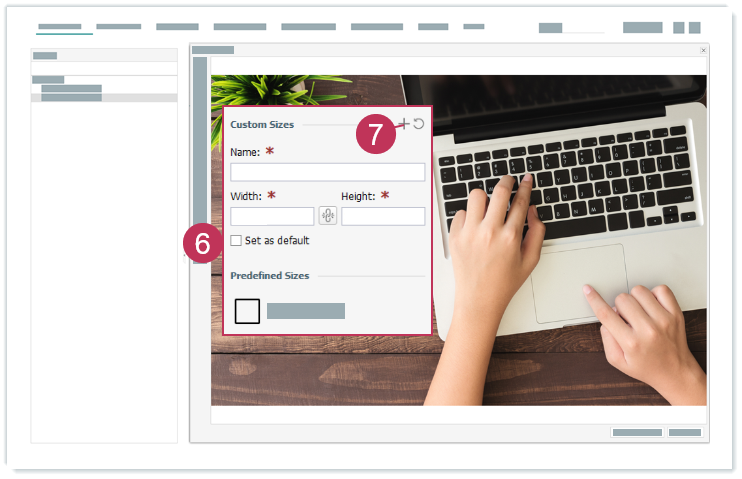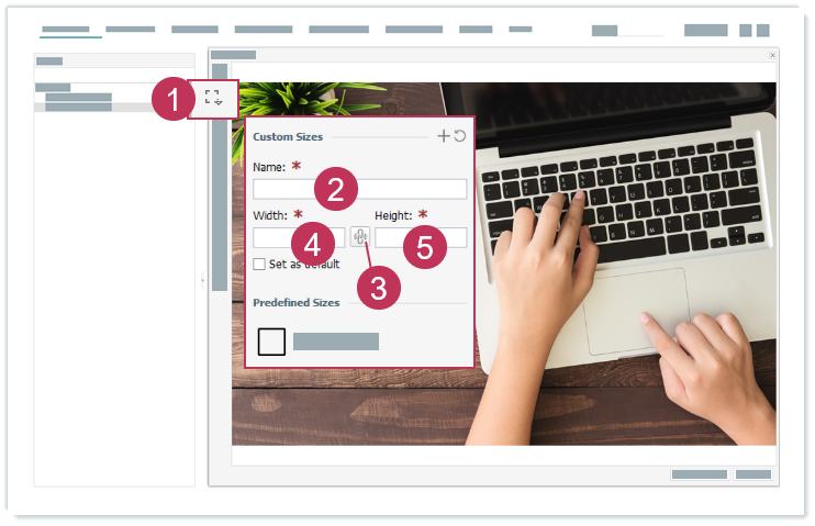 Benutzerdefinierte Größe erstellen, Handlungsschritte 1-5- Legen Sie fest, ob diese Größe als Standard verwendet werden soll.