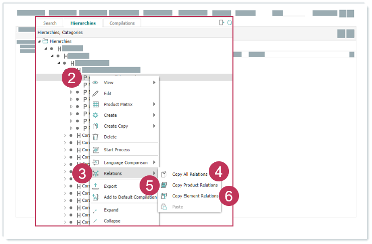 Wenn Sie das Kontextmenü von Hierarchien, Produkten und Produktvarianten im Hierarchiebaum aufrufen, können Sie bestehende Produkt- und Elementbeziehungen kopieren und sie anderen Hierarchien, Produkten und Produktvarianten zuordnen. Die nachfolgende Aufgabe zeigt, wie bestehende Beziehungen eines Produkts einem anderen Produkt zugeordnet werden.