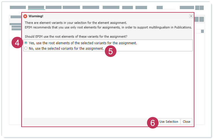 Bild aus der PowerSearch zuordnen, Handlungsschritte 1-3Wählen Sie Ja, Wurzelelemente der ausgewählten Varianten für die Zuordnung verwenden aus, um das Wurzelelement und alle untergeordneten Elementvarianten zu verwenden.