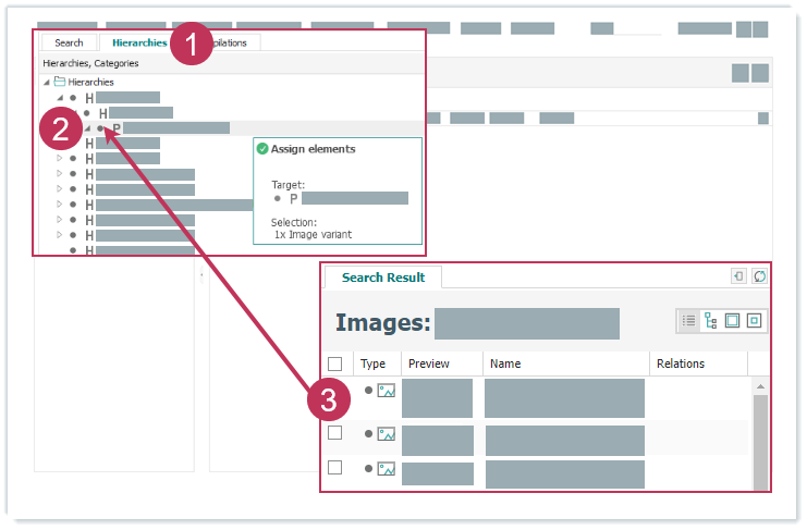 Prinzipiell können alle Elemente Hierarchien, Produkten und Produktvarianten zugeordnet werden und dadurch Beziehungen auf Basis von Beziehungstypen erstellt werden. Die nachfolgende Aufgabe zeigt, wie Bilder einem Produkt zugeordnet werden und dadurch Beziehungen erstellt werden.