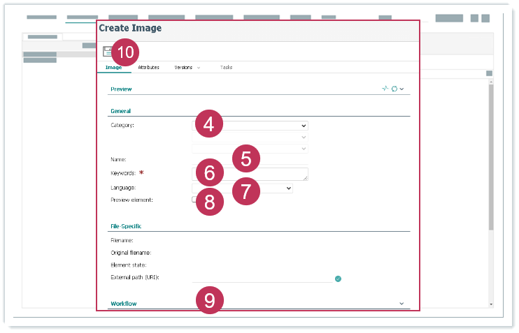 Bildelement erstellen und zuordnen, Handlungsschritte 4-10- Klicken Sie auf Upload.
