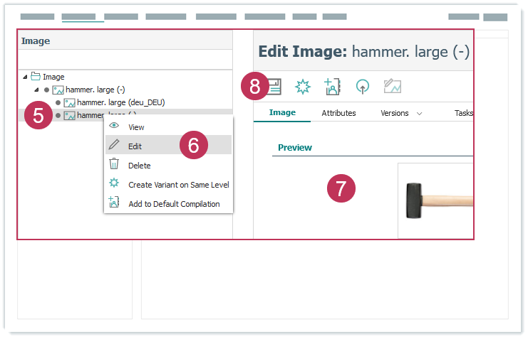 Bilder per Drag-and-drop uploaden und bearbeiten, Handlungsschritte 2-4- Klicken Sie mit der rechten Maustaste auf die Elementvariante.