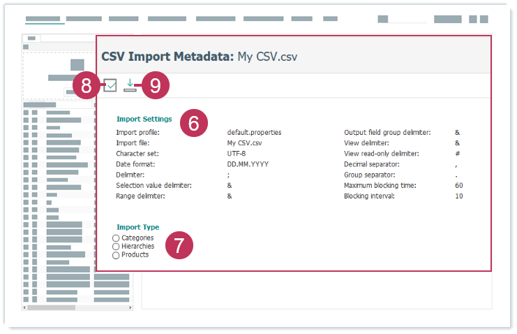 CSV-Import Metadaten, Handlungsschritte 2-5- Prüfen Sie die Importeinstellungen aus dem Importprofil.