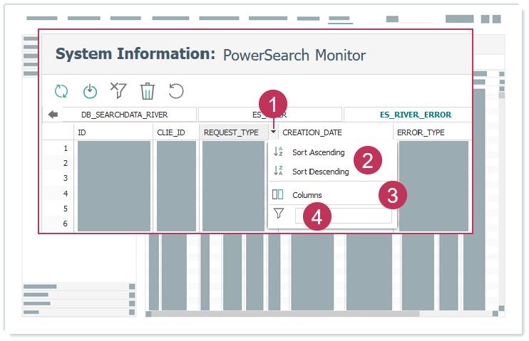 Dargestellte Datenbanktabellen für das Monitoring PowerSearch bearbeiten, Handlungsschritte 1-4- Klicken Sie auf Filter löschen, um Ihre Filterangaben wieder zu entfernen.