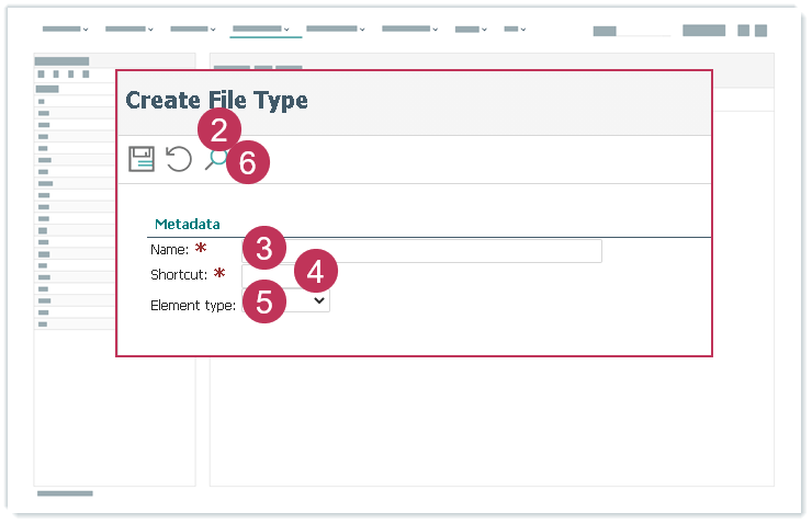 Dateityp suchen Öffnen Sie adminCONTENT → Dateitypen.Klicken Sie auf Neue Suche.Geben Sie einen Namen ein.Geben Sie ein Kürzel ein.Wählen Sie einen Elementtyp aus.Klicken Sie auf Suchen.Dateityp suchen, Handlungsschritte 2-6