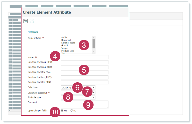 Dictionary-Elementattribut erstellen, Handlungsschritte 3-10Wählen Sie Elementattributsichten aus.