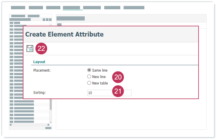 Dictionary-Elementattribut erstellen, Handlungsschritte 11-19- Wählen Sie das Layout für die Darstellung des Elementattributs beim Bearbeiten von Wurzelelementen und Elementvarianten aus.