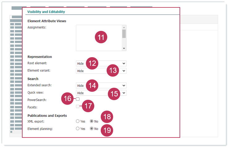 - Wählen Sie aus, ob das Elementattribut in der erweiterten Suche angezeigt wird und dass nach Elementattributwerten gesucht werden kann.