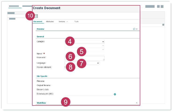 Dokumentelement erstellen und zuordnen, Handlungsschritte 4-10Klicken Sie auf Upload.