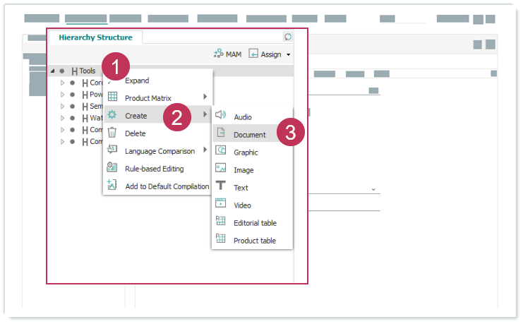 Dokumentelement erstellen und zuordnen, Handlungsschritte 1-3- Wählen Sie eine Elementkategorie aus.