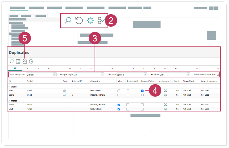 Vorhandene Zuordnungen werden gelöscht. Wenn Sie Duplikate von Wörterbucheinträgen ersetzen, werden die Zuordnungen beibehalten.Duplikate von Wörterbucheinträgen löschen, Handlungsschritte 2-5