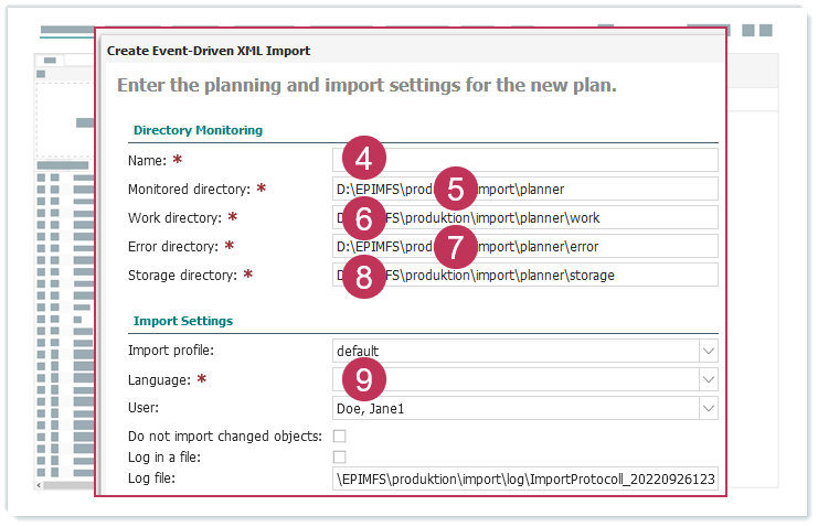 .startim Stammverzeichnis gespeichert werden. Ansonsten wird die Verarbeitung der Importdatei nicht gestartet. - Stammverzeichnisse für den XML-Import können mit dem Systemparameter Planner_MonitoredRootDirectories im Ordner Planner (Systemparameter) festgelegt werden.