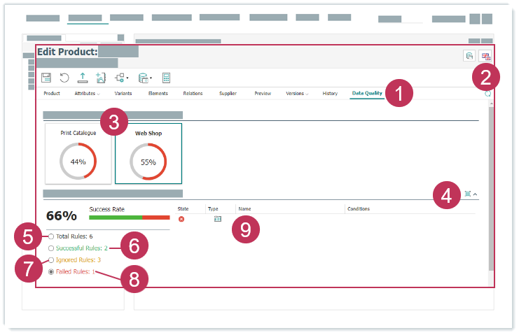 - Produktattributwerte von Referenzen werden bei der Berechnung der Datenqualität berücksichtigt, fehlgeschlagene Regeln können aber nur für das Originalobjekt bearbeitet werden.