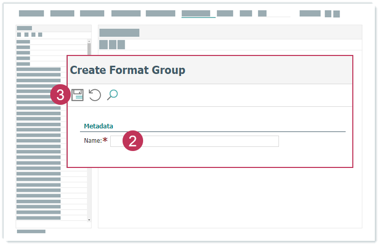 Formatgruppe erstellen Öffnen Sie adminPUBLISH → Formatierung → Gruppen.Geben Sie einen Namen ein.Klicken Sie auf Speichern.Formatgruppe erstellen, Handlungsschritte 2-3