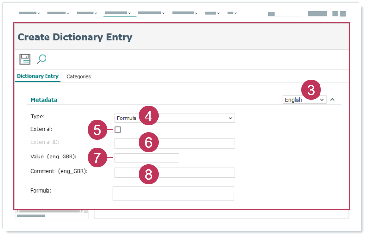 Externe Formeln können nur erstellt werden, wenn der Systemparameter Enable_ExternalMetadataRepository im Ordner Metadata Repository (Systemparameter) aktiviert ist und das Benutzerrecht Metadaten-Repository: Externe Wörterbucheinträge erstellen und aktualisieren zugeordnet ist.