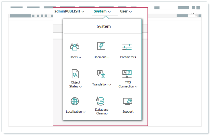 Über das Hauptmenü adminPUBLISH werden exportspezifische Einstellungen vorgenommen, zum Beispiel Ausgabefelder definiert oder Publikationsstrukturen geplant.