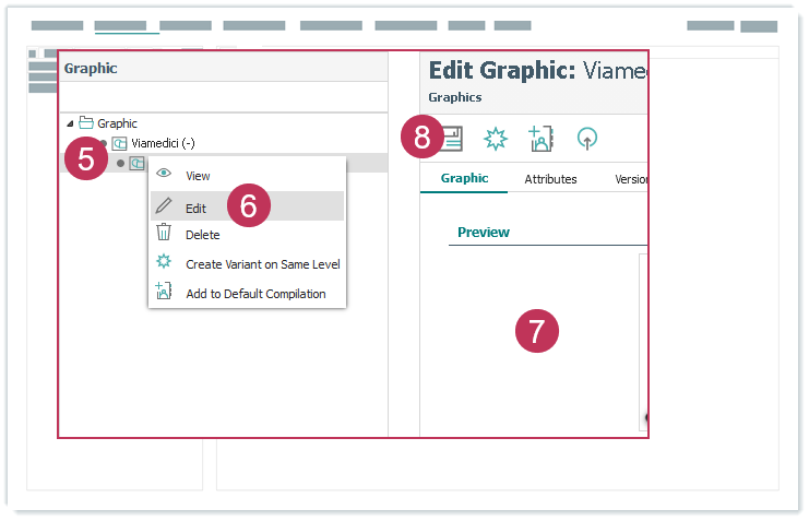 Grafiken per Drag-and-drop uploaden und bearbeiten, Handlungsschritte 2-4- Klicken Sie mit der rechten Maustaste auf die Elementvariante.
