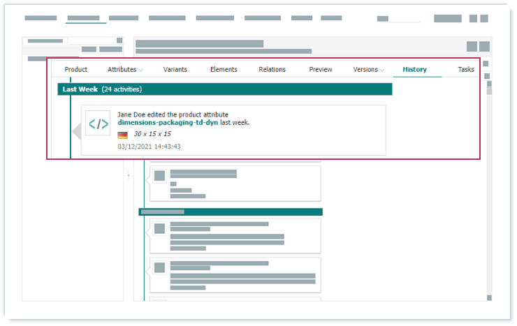 Beim Bearbeiten von Hierarchien, Produkten und Produktvarianten können Sie die Historie des einzelnen Objekts unterhalb der Registerkarte Historie prüfen. Die Registerkarte Historie wird nur angezeigt, wenn das Benutzerrecht Registerkarte für Historie aus der Benutzerrolle viaCONTENT (Benutzerrolle) Ihrer Benutzergruppe zugeordnet ist.