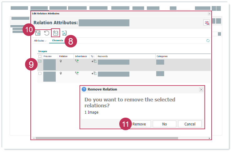 Konfigurierbare Beziehungsattribute bearbeiten, Handlungsschritte 4-7- Klicken Sie auf die Registerkarte Elemente, um Elemente zu prüfen und Beziehungen zu entfernen.