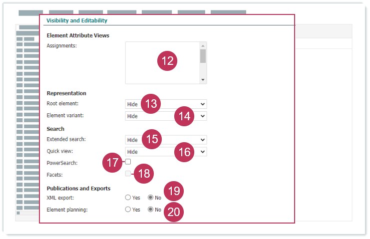 Wählen Sie aus, ob das Elementattribut bei der Elementplanung in der Strukturplanung für Publikationen als Filterkriterium verwendet wird.