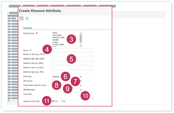 - Wählen Sie aus, ob das Elementattribut in der erweiterten Suche angezeigt wird und dass nach Elementattributwerten gesucht werden kann.