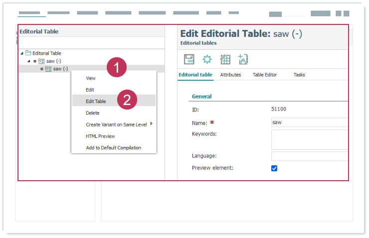 - Klicken Sie mit der rechten Maustaste auf die redaktionelle Tabelle, in der ein Objekt wiederverwendet werden soll.