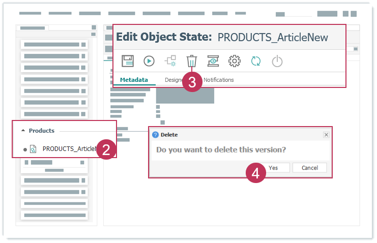 - Wenn der Objektstatus mehrere Versionen hat, wird nur die in der Bearbeitung ausgewählte Version gelöscht.