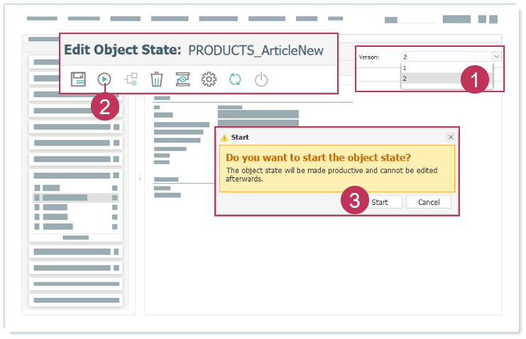 - Klicken Sie auf Starten, um die ausgewählte Version des Objektstatus produktiv zu verwenden.
