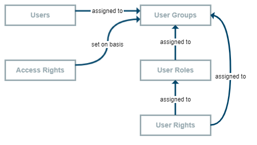 Benutzerrollen können beliebig vielen Benutzergruppen zugeordnet werden. Benutzerrechte können beliebig vielen Benutzerrollen zugeordnet werden. Zusätzlich können Benutzerrechte den Benutzergruppen direkt zugeordnet werden.
