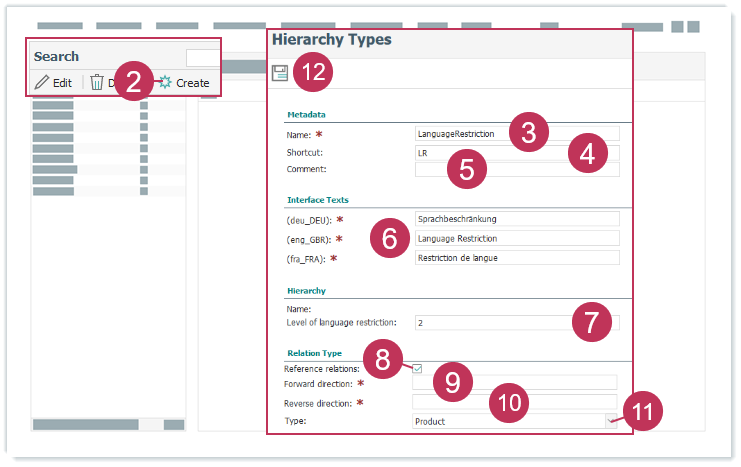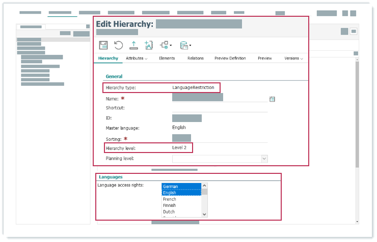 Ergebnis: Beim Erstellen einer Hierarchie mit dem erstellten Hierarchietyp können Sie ab der für die Einschränkung definierten Hierarchiestufe die Sprachen auswählen.