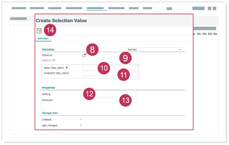 Externe String-Auswahlwerte können nur erstellt werden, wenn der Systemparameter Enable_ExternalMetadataRepository im Ordner Metadata Repository (Systemparameter) aktiviert ist und das Benutzerrecht Metadaten-Repository: Externe Auswahlwerte erstellen und aktualisieren zugeordnet ist.