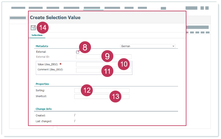 - Externe String-Auswahlwerte können nur erstellt werden, wenn der Systemparameter Enable_ExternalMetadataRepository im Ordner Metadata Repository (Systemparameter) aktiviert ist und das Benutzerrecht Metadaten-Repository: Externe Auswahlwerte erstellen und aktualisieren zugeordnet ist.
