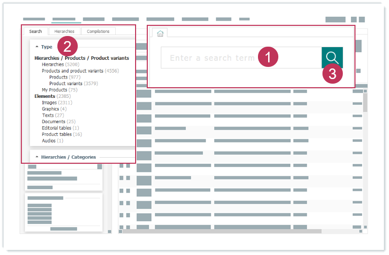 Die PowerSearch ist über viaCONTENT → Suche oder über viaPRODUCT → Suche geöffnet.
