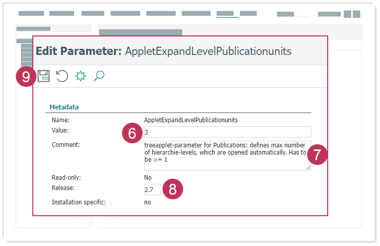 Systemparameter AppletExpandLevelPublicationunits bearbeiten, Handlungsschritte 6-9