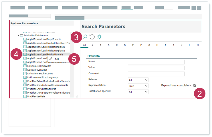 Systemparameter AppletExpandLevelPublicationunits bearbeiten, Handlungsschritte 2-5- Geben Sie die Anzahl der aufgeklappten Hierarchiestufen im Publikationsbaum ein.