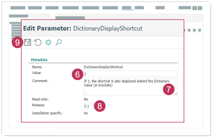 Systemparameter DictionaryDisplayShortcut bearbeiten, Handlungsschritte 6-9