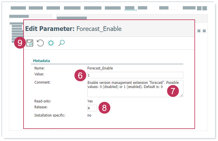 Systemparameter Forecast_Enable bearbeiten, Handlungsschritte 6-9