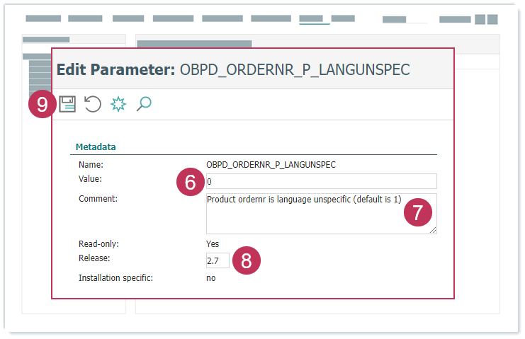 Systemparameter OBPD_ORDERNR_P_LANGUNSPEC bearbeiten, Handlungsschritte 6-9