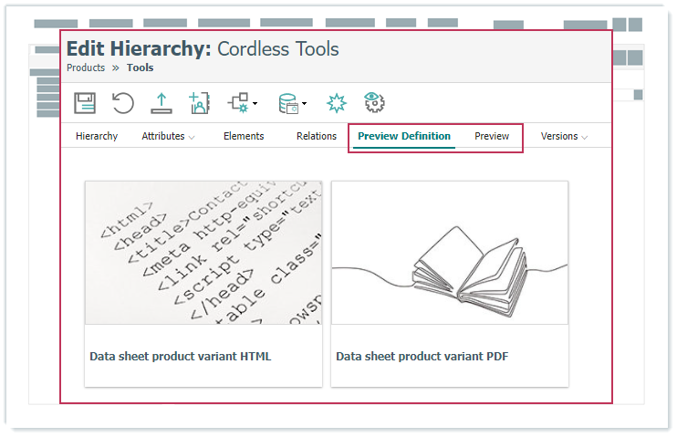 Ergebnis: Die Registerkarten Vorschaudefinition und Vorschau werden beim Bearbeiten von Hierarchien, Produkten und Produktvarianten angezeigt und die Produktvorschau kann verwendet werden.