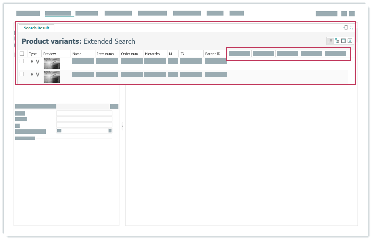 Sie können die Produktattribute festlegen, die nach einer Suche für die Suchbereiche Produkte, Produktvarianten und Produkte und Produktvarianten in der Standardsuche als zusätzliche Spalten in der Listenansicht angezeigt werden.