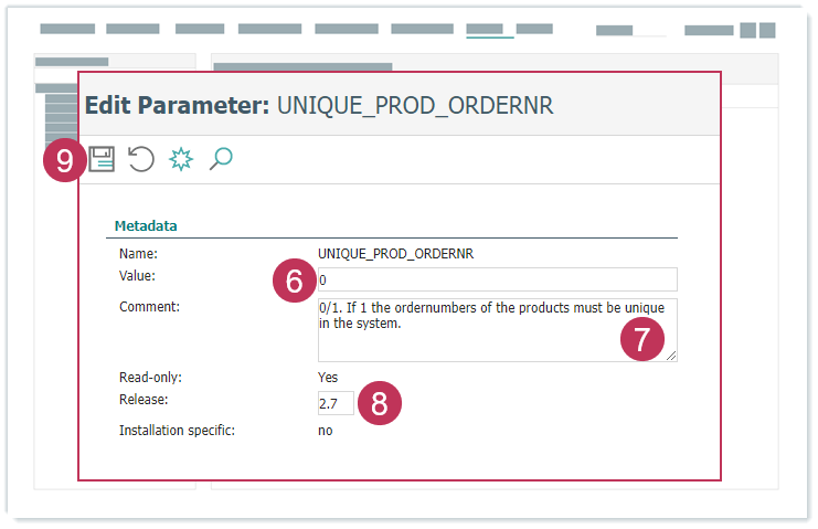 Systemparameter UNIQUE_PROD_ORDERNR bearbeiten, Handlungsschritte 6-9