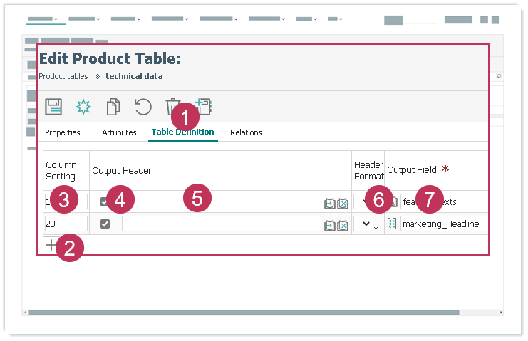 Tabellendefinition bearbeiten, Handlungsschritte 1-7- Wählen Sie Formate für die Spalteninhalte aus.