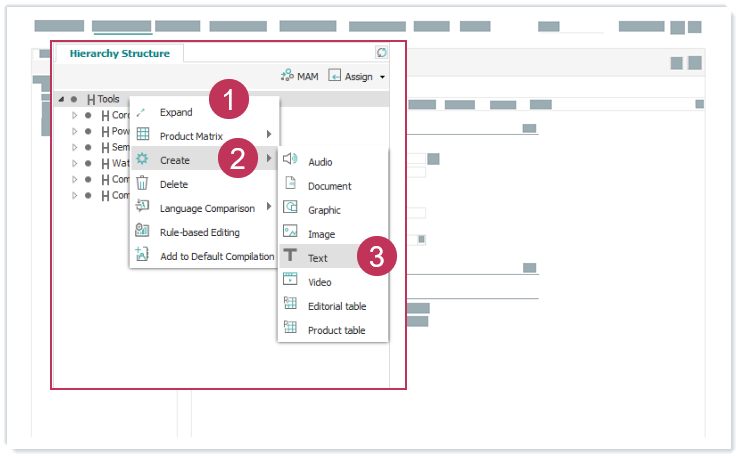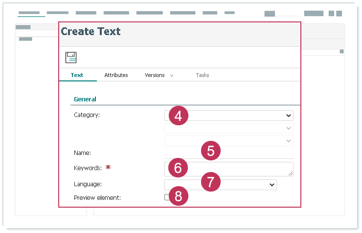 Textelement erstellen und zuordnen, Handlungsschritte 1-3- Wählen Sie eine Elementkategorie aus.