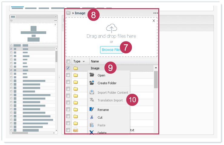 Übersetzte Dateien importieren, Handlungsschritte 2-6- Klicken Sie auf Dateien suchen und wählen Sie den Inhalt des Ordners der downgeloadeten Sammlung inklusive der Datei