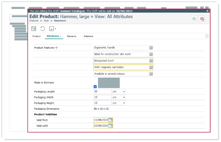 Bearbeitete Produktattributwerte in einem Versionsentwurf (gelbe Hervorhebung)