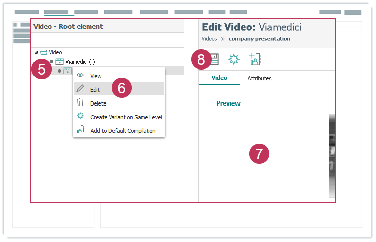 Videos per Drag-and-drop uploaden und bearbeiten, Handlungsschritte 2-4- Klicken Sie mit der rechten Maustaste auf die Elementvariante.